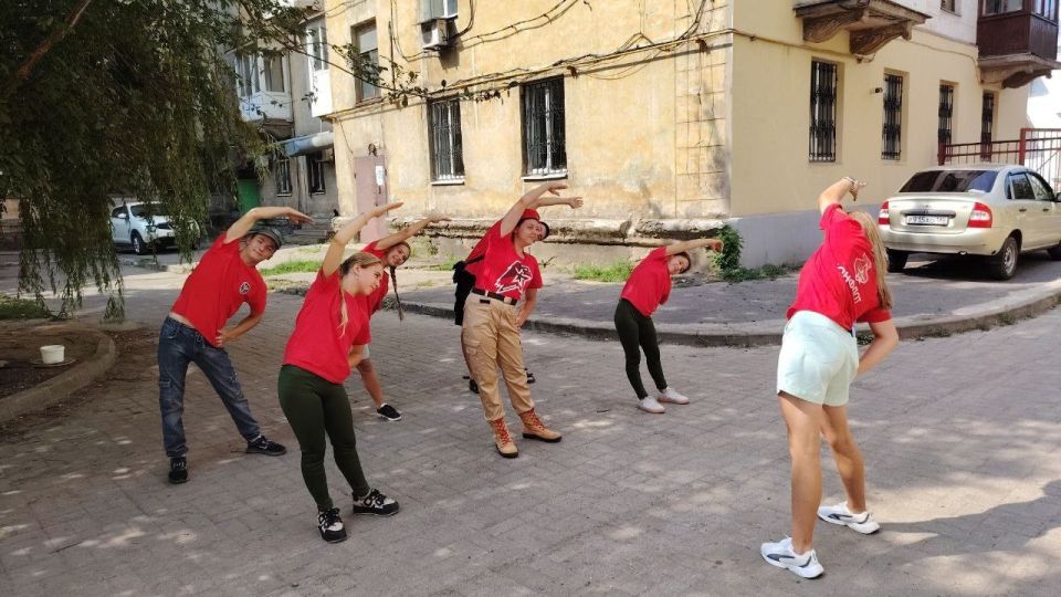 В День физкультурника председатель Совета юнармейских командиров городского округа Макеевка, Никитина Алёна, провела зарядку для юнармецев местного отделения городского округа Макеевка имени Героя СВО Линева А. М.