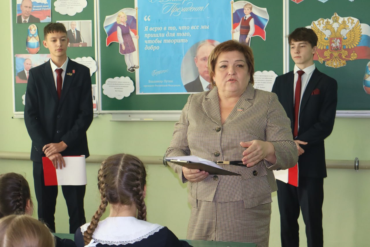 Торжественно открыла познавательный урок директор нашего лицея, Депутат Народного совета ДНР, фракция «Единая Россия» Наталья Бурцева.