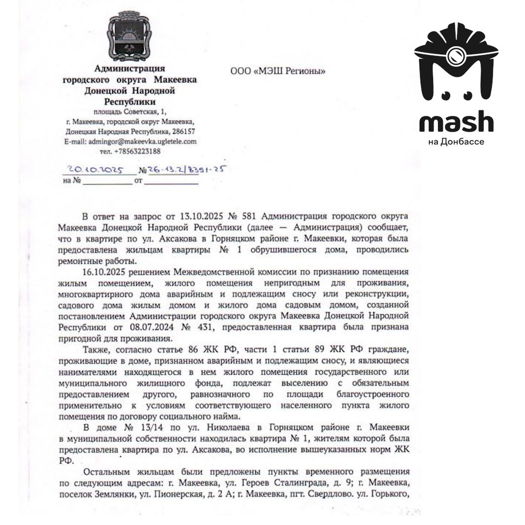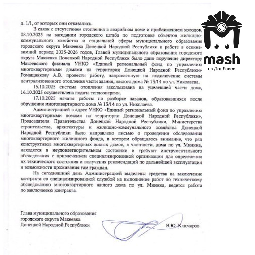 В уцелевшую часть обрушившейся двухэтажки на Николаева провели и подключили отопление. Люди продолжают там жить, от ПВР они отказались. 17 октября начался разбор завалов. В администрации Mash на Донбассе сказали, что выделили деньги на обследование соседнего дома. Но работы пока не начались — нужно заключить контракт с подрядчиком.