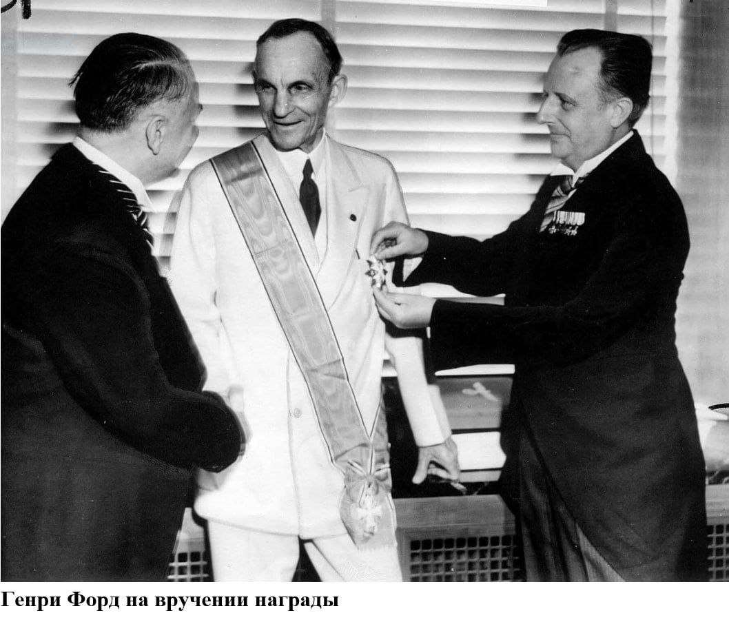 Так кто же накачал мышцы Германии и осыпал её деньгами? Почему в те времена у всех немцев в кабинетах висел портрет Гитлера, а у самого Гитлера висел портрет его любимого спонсора – Генри Форда? Ведь именно он активно спонсировал партию Гитлера и на каждый день рождения Гитлера присылал ему солидный денежный подарок вплоть до 1945 года. Генри Форд даже был награждён высшей наградой Третьего рейха для иностранцев – Орденом Заслуг германского орла.