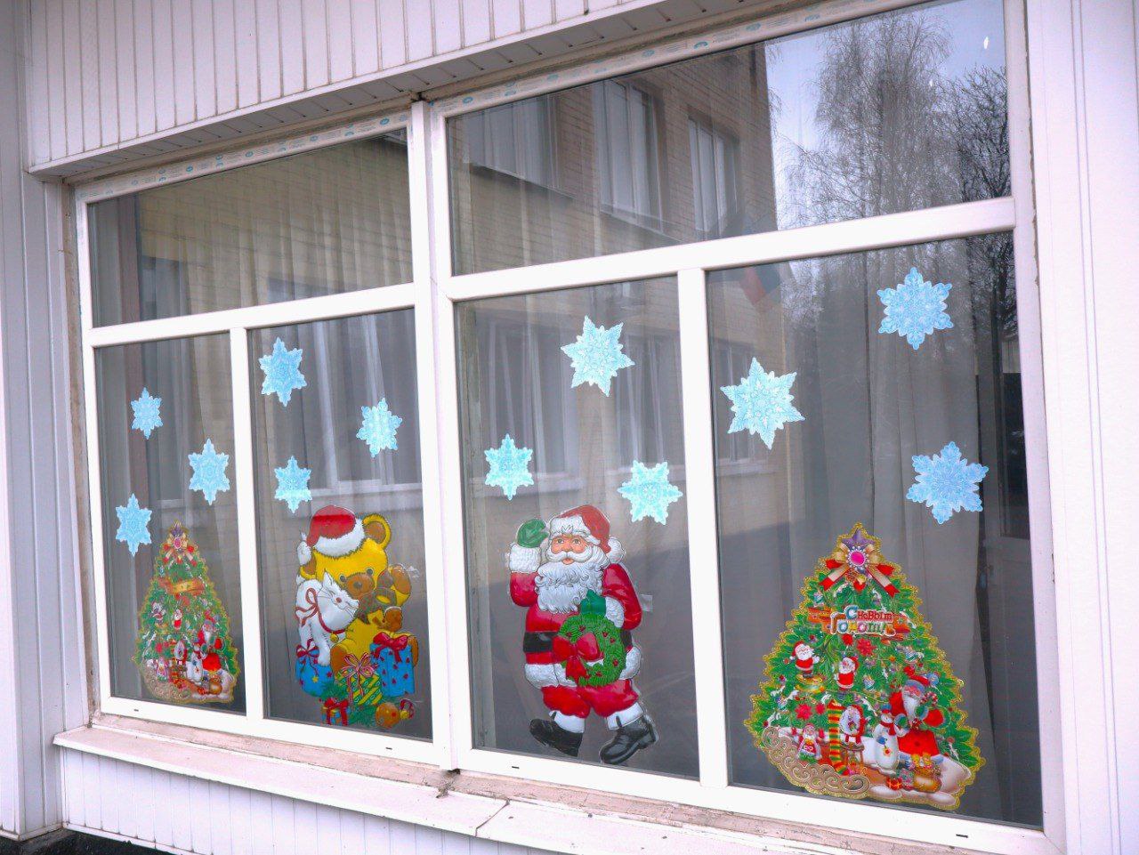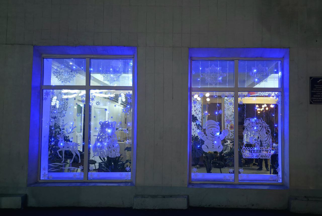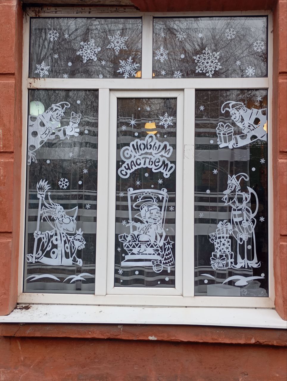 Любимые герои мультфильмов и сказок оживают на стёклах, уступая место заснеженным пейзажам и весёлым снеговикам. С помощью красок, трафаретов, бумажных аппликаций и других подручных средств педагоги, учащиеся и их родители дают волю фантазии, создавая неповторимые образы, пропитанные духом Нового года