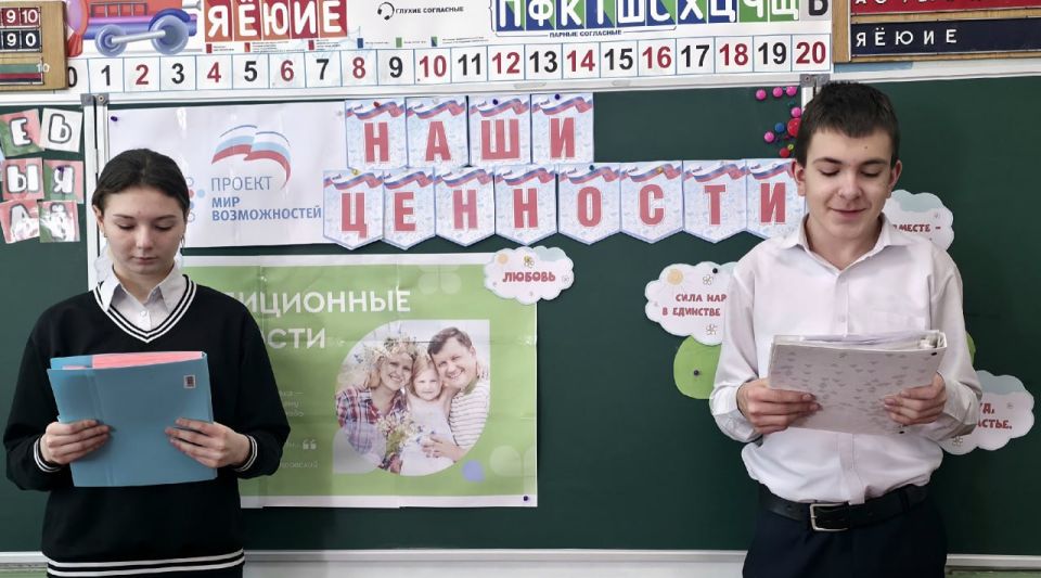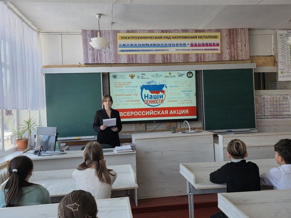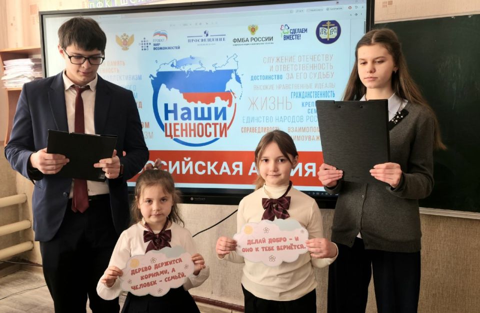 В рамках акции "Наши ценности", направленной на формирование гражданской позиции и правильного мировоззрения у учащихся, в общеобразовательных организациях городского округа Макеевка были проведены тематические мероприятия