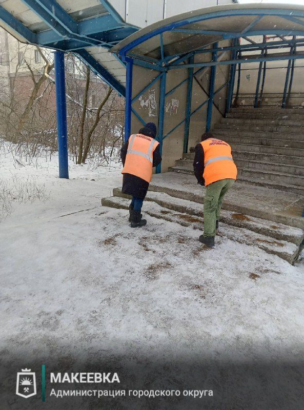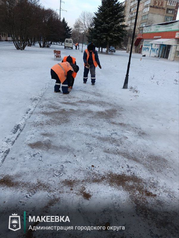 Сотрудники «Песпективы» выполняют отсыпку пешеходных дорог противогололёдными материалами, обеспечивая безопасность горожан в зимний период.