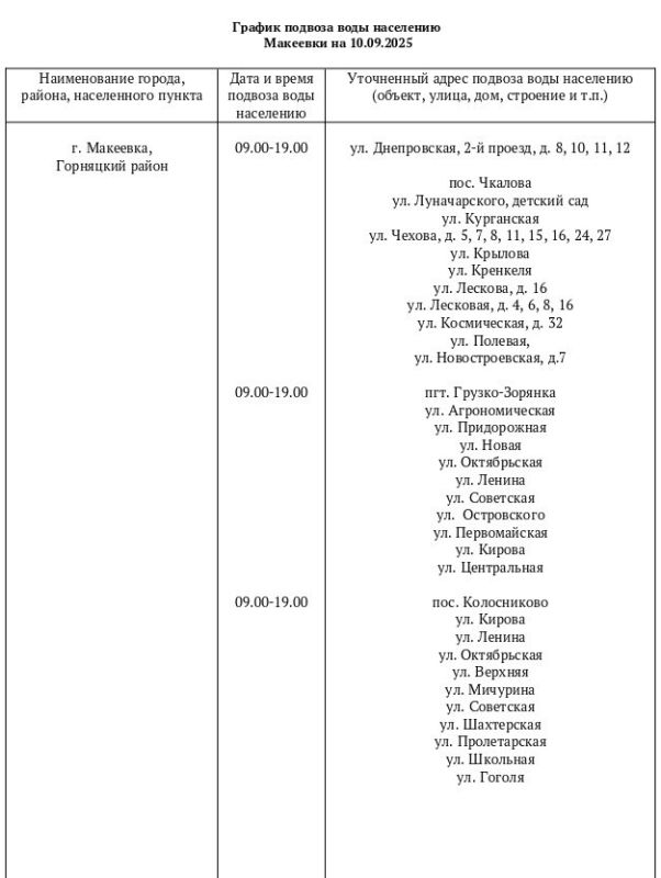 Завтра, 10 сентября, в Макеевке будет организован подвоз воды для жителей, в дома которых из-за недостаточного количества подаваемой воды не поступила вода в установленный графиком день.