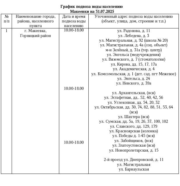 Сегодня, 31 июля, в Макеевке будет организован подвоз воды для жителей, в дома которых из-за недостаточного количества подаваемой воды не поступила вода в установленный графиком день.