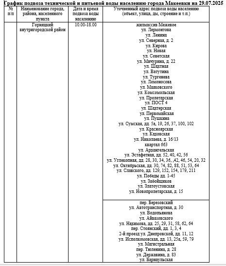 К сведению макеевчан! С целью улучшения водоснабжения на этапе тестирования, в график подачи воды 1 раз в 3 дня, внесены изменения.С 29.07.2025 (1 день) водоснабжение в Макеевке будет осуществляться по следующему графику.
