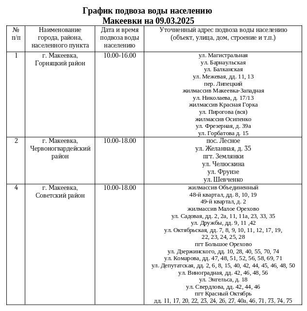 Завтра, 9 марта, в Макеевке будет организован подвоз воды для жителей, в дома которых из-за недостаточного количества подаваемой воды не поступила вода в установленный графиком день.