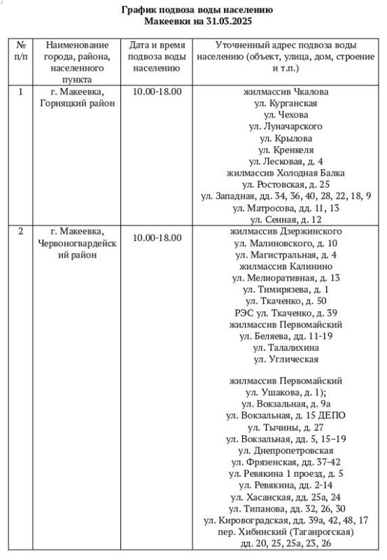 Завтра, 31 марта, в Макеевке будет организован подвоз воды для жителей, в дома которых из-за недостаточного количества подаваемой воды не поступила вода в установленный графиком день.