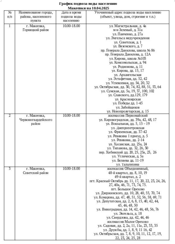 График подвоза воды населению городского округа Макеевка