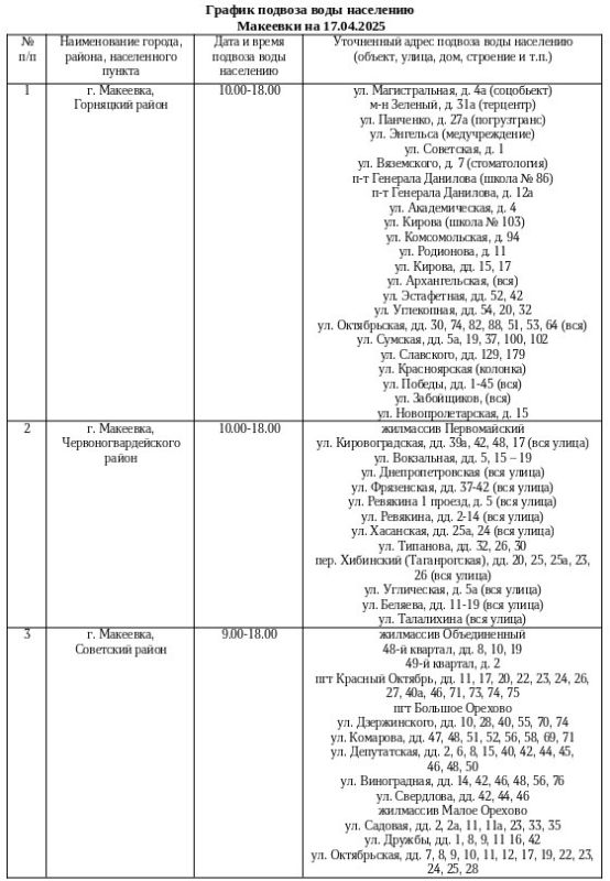 График подвоза воды населению городского округа Макеевка
