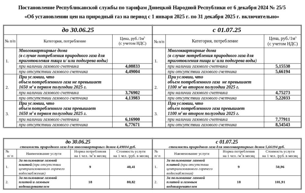 Макеевское управление по газоснабжению и газификации «Донбассгаз» филиала ООО «ЧНМГ» информирует, что с 01.01.2025 г. в соответствии с постановлением Республиканской службы по тарифам Донецкой Народной Республики от 6 декабря 2024 г. № 25/5 «Об установлении цен на природный газ на период с 1 января 2025 г. по 31 декабря 2025 г. включительно» изменяются цены на природный газ.