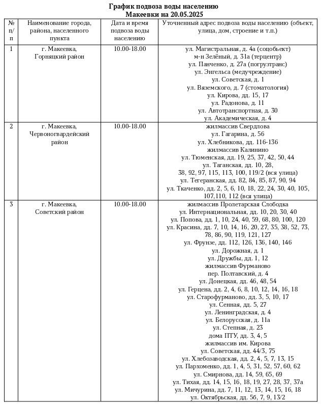 Завтра, 20 мая, в Макеевке будет организован подвоз воды для жителей, в дома которых из-за недостаточного количества подаваемой воды не поступила вода в установленный графиком день.
