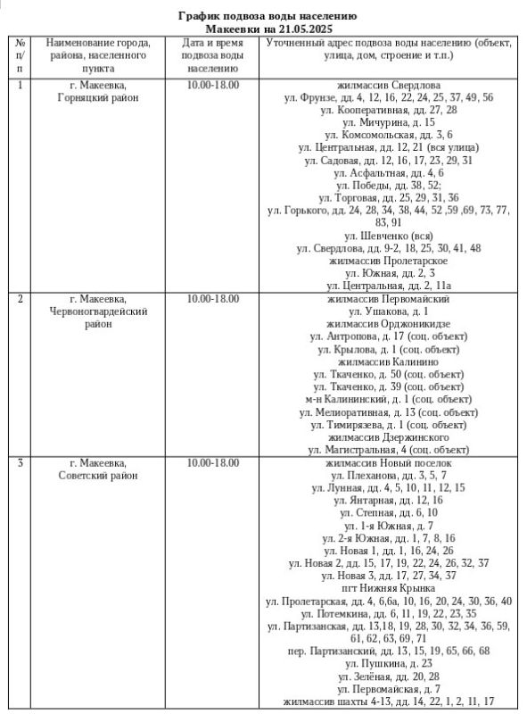График подвоза воды населению городского округа Макеевка