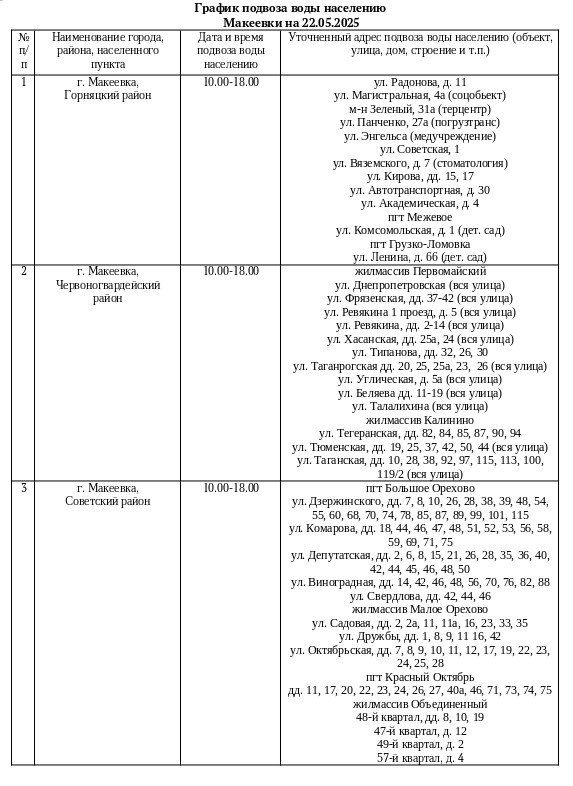 График подвоза воды населению городского округа Макеевка