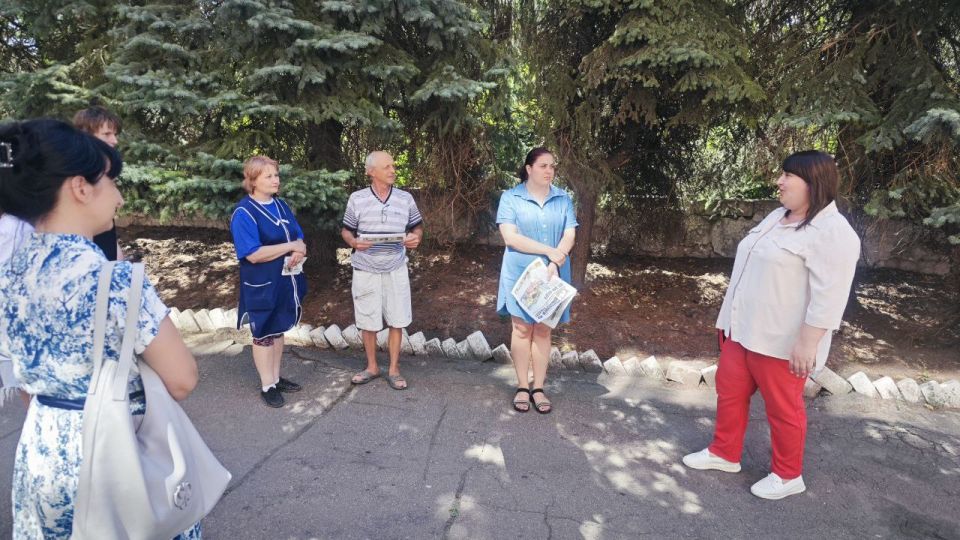 Сегодня, 29 июля, спикер-активист Татьяна Синяговская и заместитель руководителя Управы Кировского внутригородского района Администрации городского округа Макеевка Донецкой Народной Республики Ирина Воронина, провели встречу с населением на подведомственной территории по ул. Глинки 22а.