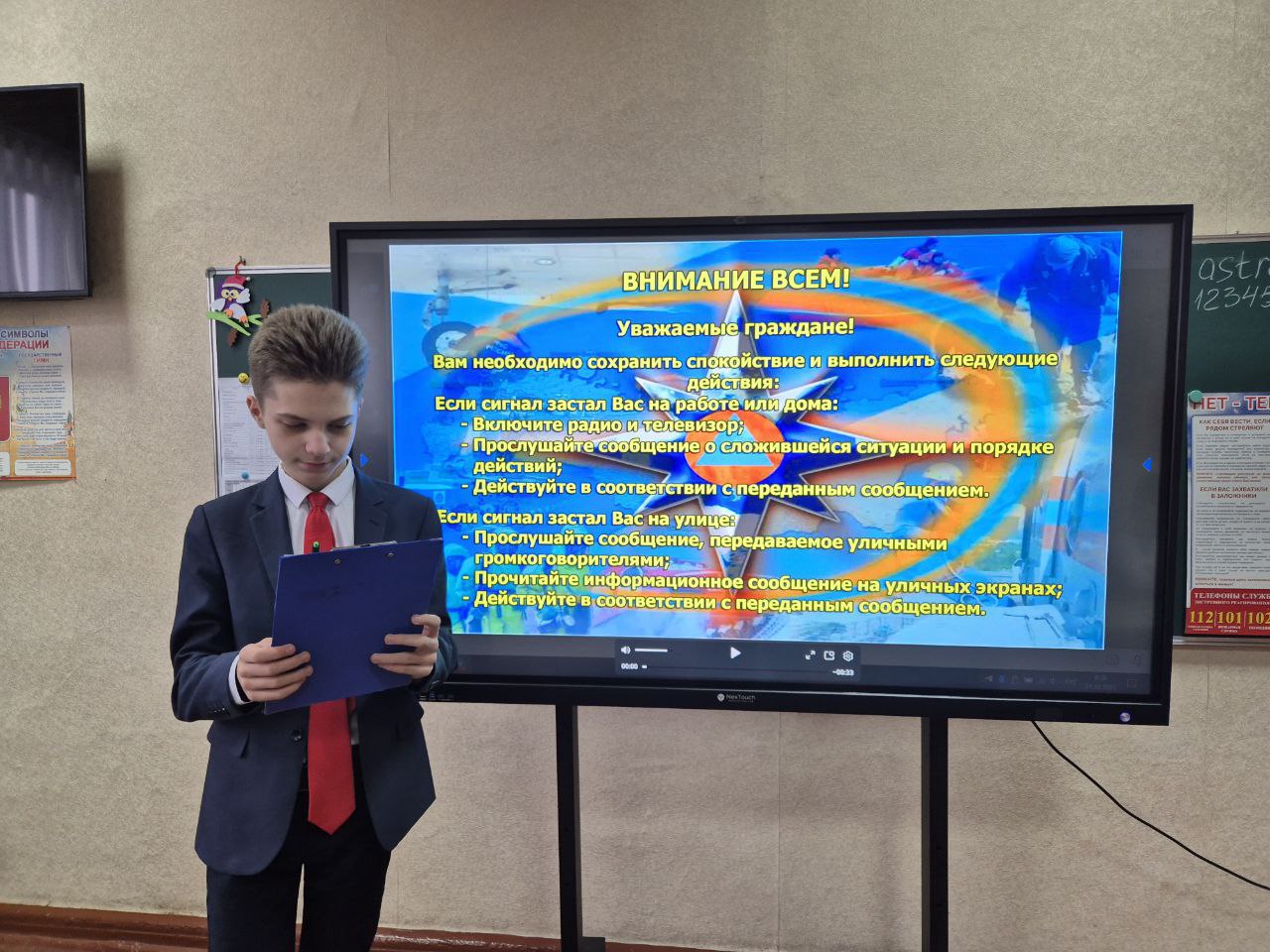 В ходе мероприятия учащиеся ознакомились с историей возникновения Гражданской обороны в России, функциями Гражданской обороны, с руководителями ГО, с задачами ГО, с сигналами ГО и действиями населения в военное и мирное время. Дети рассмотрели основные правила поведения в чрезвычайных ситуациях, чтобы быть готовыми к любым вызовам, узнали, как правильно реагировать на сигнал оповещения «ВНИМАНИЕ ВСЕМ!».