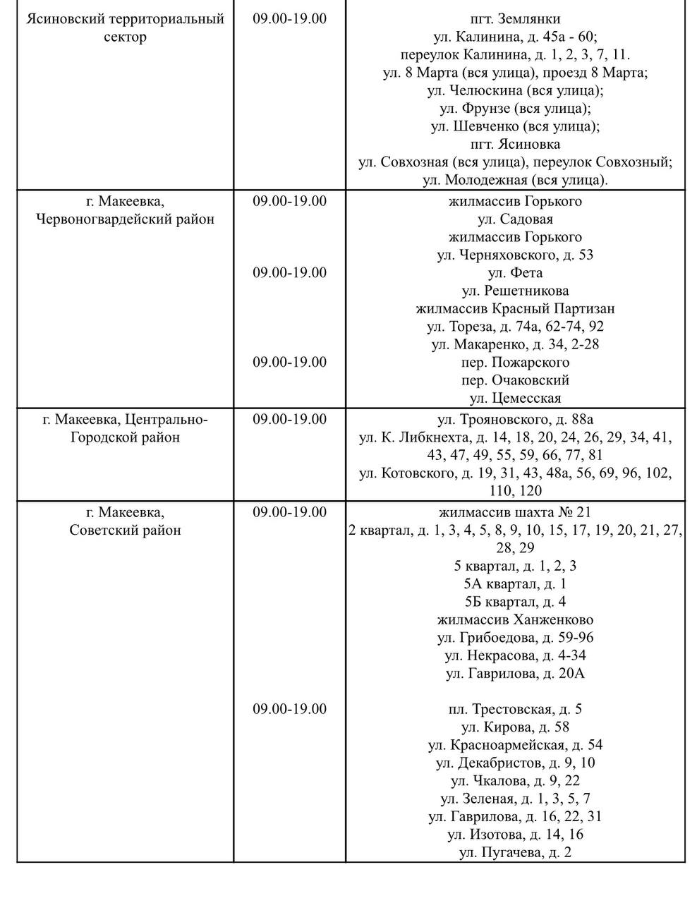 Горняцкий район:водоснабжение:жилмассив МакНИИ, д. 19;на пересечении ул. Абакумова и Успенского.водоотведение:ул. Целинная, д. 26;ул. Перова, д. 8, 10, 16;ул. Кирова, д. 28, 29;ул. Ушинского, д. 5/12, 10, 11. Советский район:...