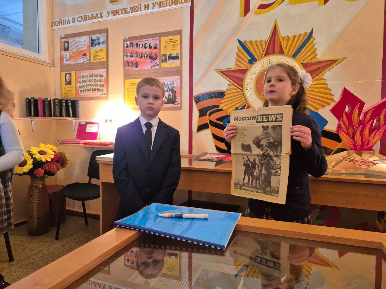 Отряд "Наследники Победы" (3-А класс) под руководством классного руководителя Натальи Огневой провели экскурсию для учащихся ГБОУ "СШ № 57 Г.О. МАКЕЕВКА" и ГБОУ "СШ № 22 Г.О. МАКЕЕВКА". Экскурсоводы с волнением рассказывали о событиях тех огненных лет Великой Отечественной войны, вспоминали учеников и учителей школы, которые ушли на фронт защищать Родину. С особой гордостью ребята поведали о герое - выпускнике Викторе Праваторове, который 30 апреля 1945 года в составе разведгруппы водрузил Знамя Победы над Рейхстагом.