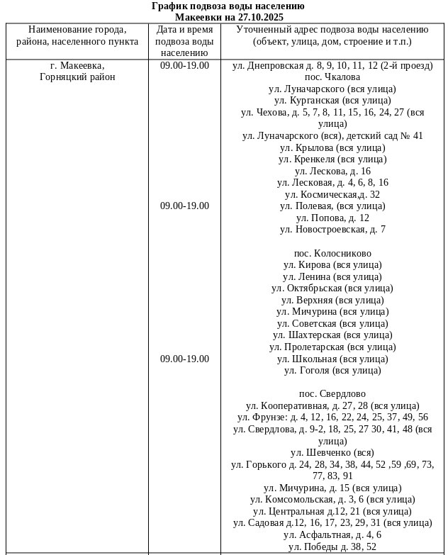 Сегодня, 27 октября, в Макеевке будет организован подвоз воды для жителей, в дома которых не поступила вода в установленный графиком день. В Макеевке полицейские проводят профилактическую отработку «Должник» С 27 по 30 октября на...