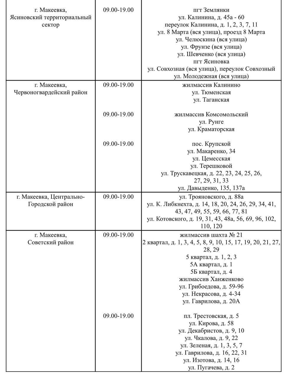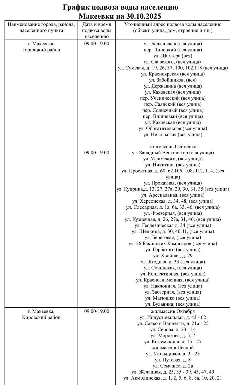 График подвоза воды населению городского округа МакеевкаЗавтра, 30 октября, в Макеевке будет организован подвоз воды для жителей, в дома которых не поступила вода в установленный графиком день.