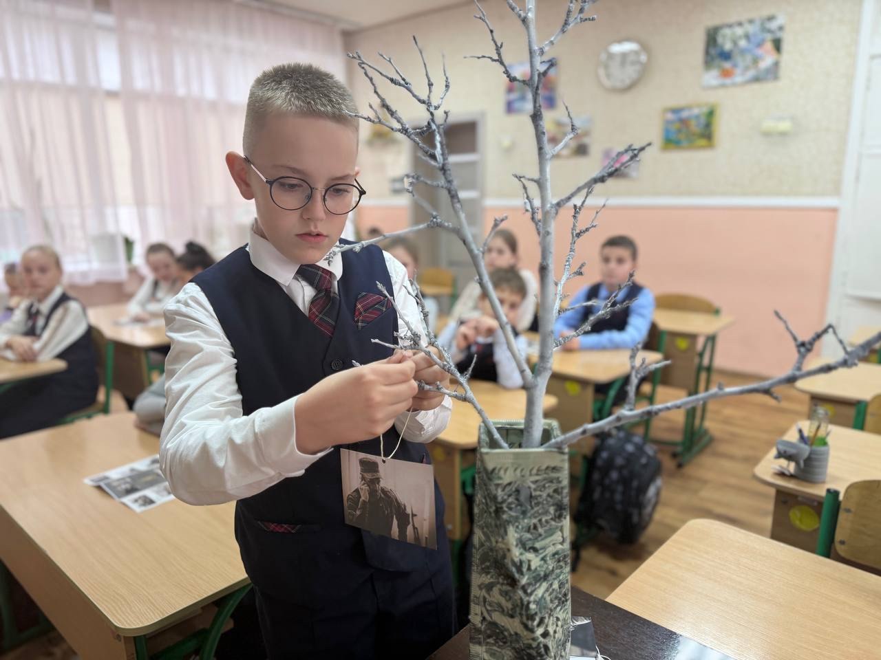 В рамках акции «Дерево памяти» учащиеся создали символическое дерево с фотографиями бойцов, чей подвиг нельзя забыть.