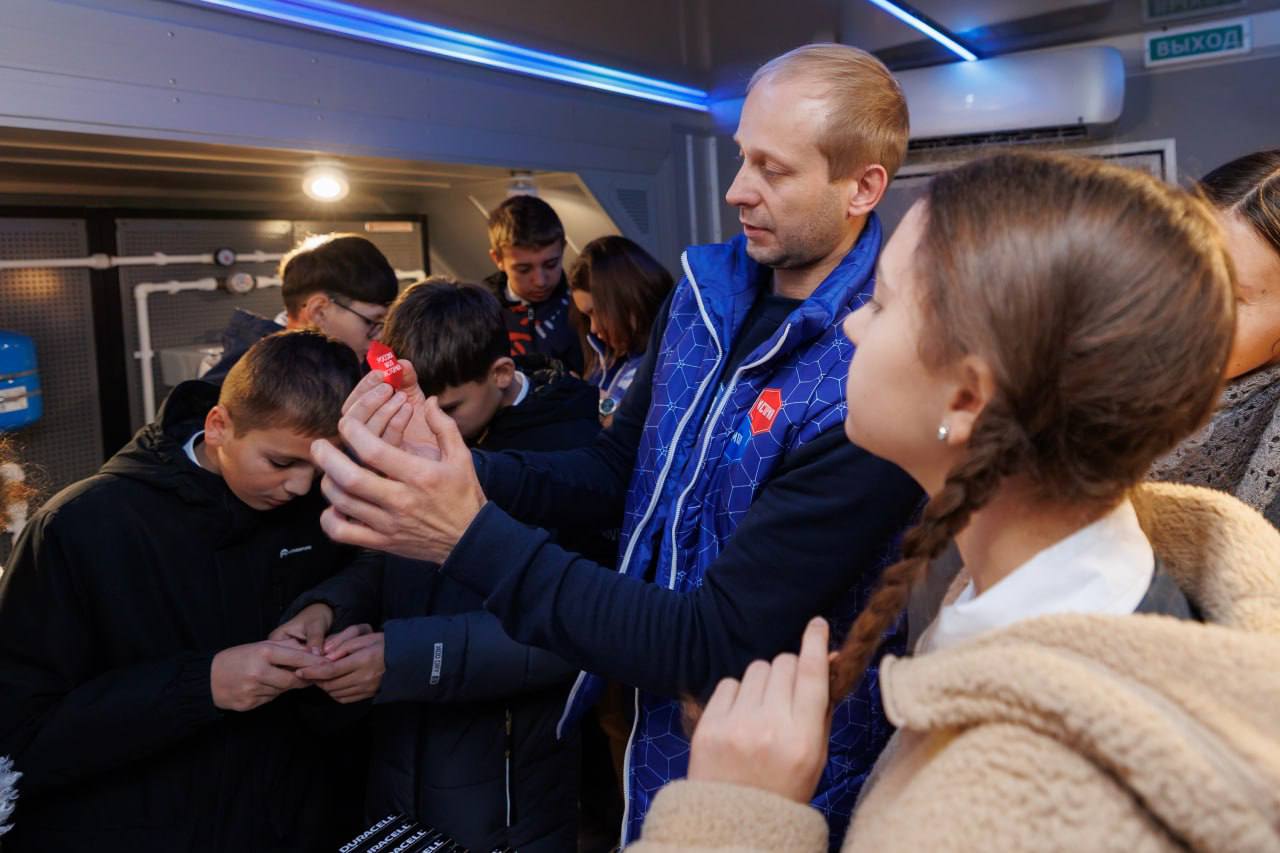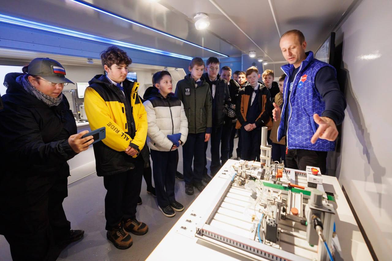 Организаторы рассказали, что для гостей выставки подготовили обзорную экскурсию с викториной. А еще перед ребятами выступал дружелюбный робот Аксель, который уже стал частью команды организаторов.