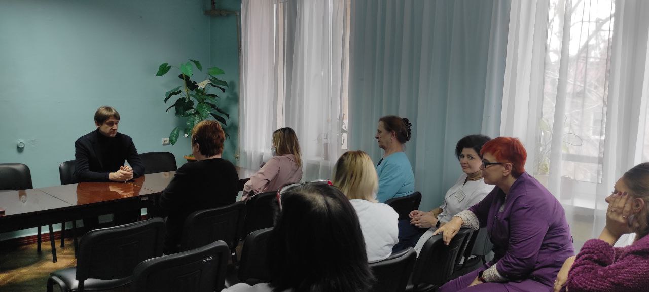 26 ноября, первый заместитель руководителя Управы Кировского внутригородского района Администрации городского округа Макеевка Донецкой Народной Республики Алексей Еськов провел встречу с трудовым коллективом Государственного бюджетного учреждения Донецкой Народной Республики «Городской противотуберкулёзный диспансер города Макеевки».