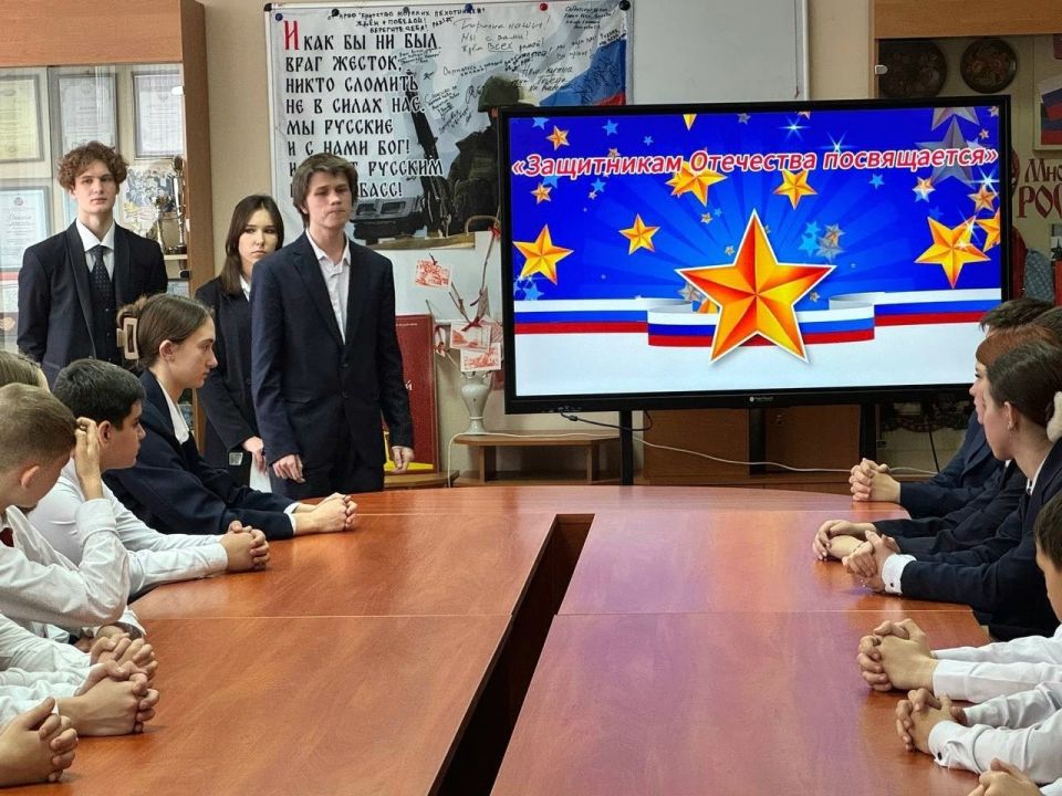 Литературно- музыкальная композиция "Защитникам Отечества посвящается" объединила ребят из разных классов: членов кружков "Юные музееведы", школьный театр "Сцена", школьный хор "Феерия".