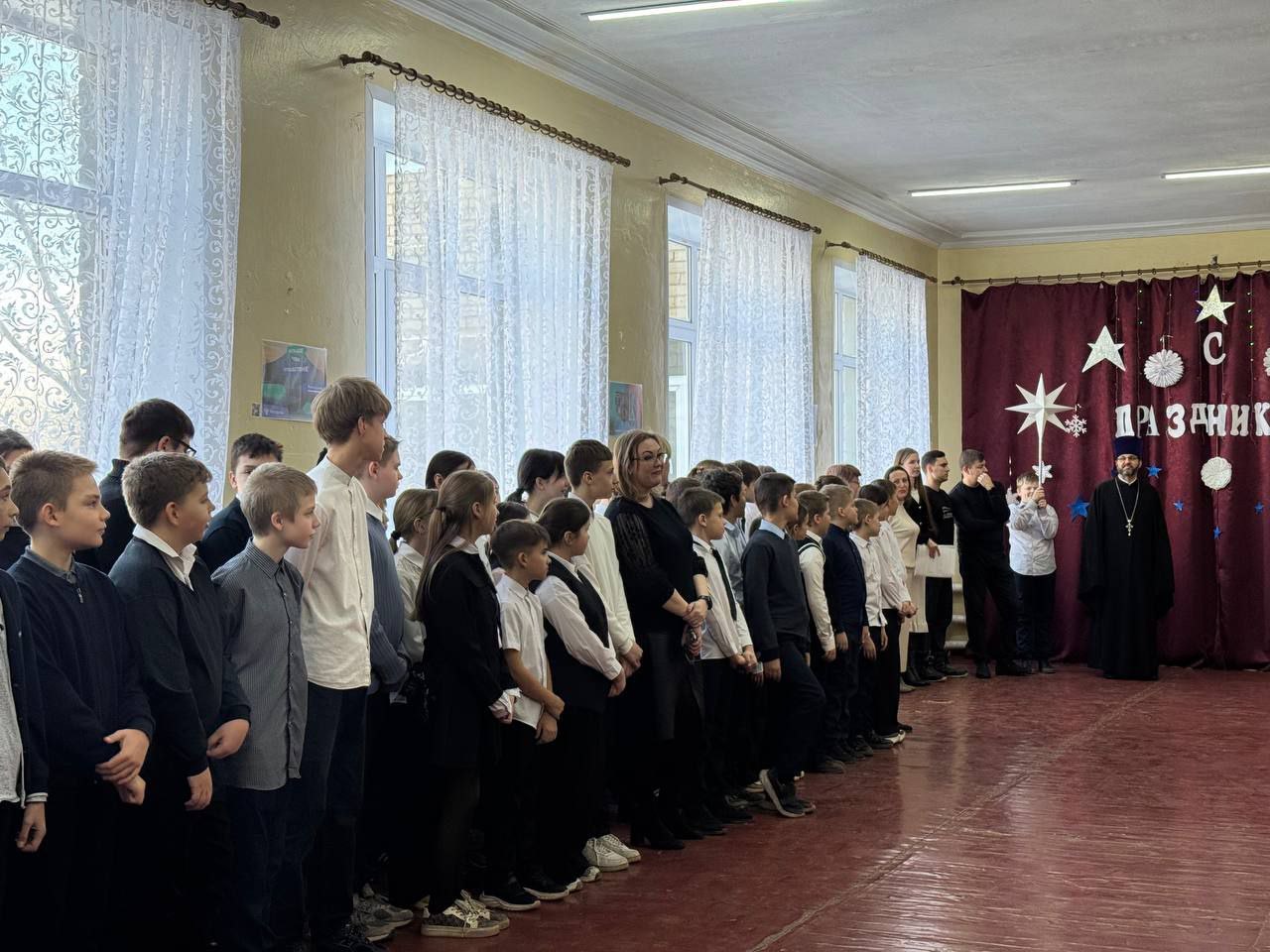 16 января 2026 года в ГБОУ "СШ № 95 Г.О. МАКЕЕВКА" состоялось знаменательное событие: ребята принимали настоятеля храма Рождества Христова Георгиевского благочиния города Макеевки, протоиерея Ростислава Карпуся, а также представителей архиерейского хора центрального собора города