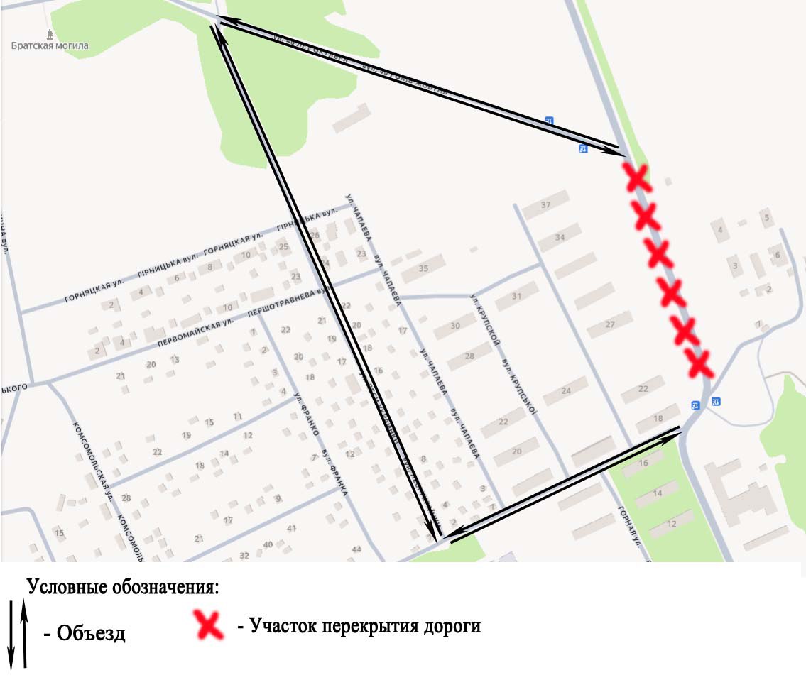 Объезд участка автодороги будет осуществляться по улицам 40 лет Октября, Леси Украинки и пер. Школьного.
