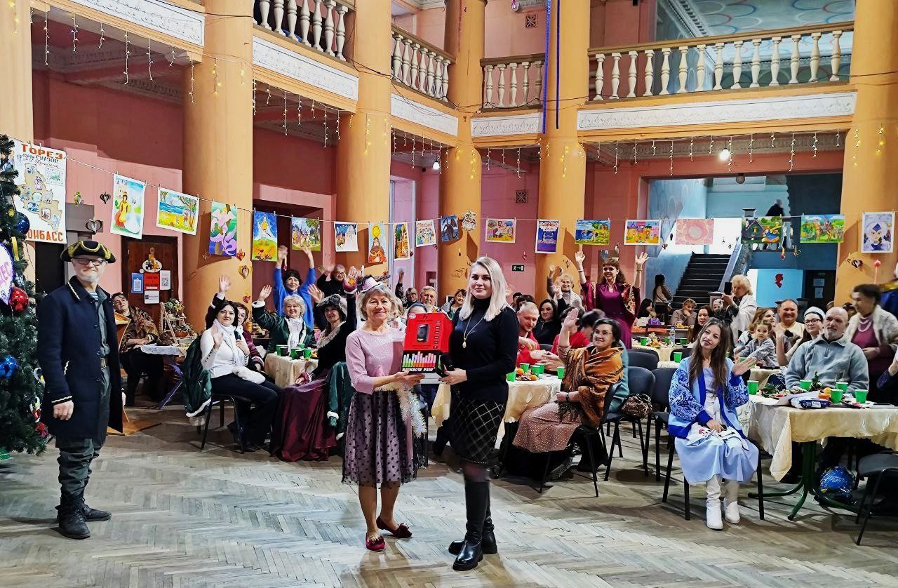 Председатель Совета женщин города Тореза Марина Зверева поздравила всех присутствующих с новогодними праздниками и вручила музыкальные колонки Елене Задонской, Владимиру Герасимову и руководителю семейного клуба "Рассвет" Елене Полеховой. Эти подарки были предоставлены Общественной организацией «Русский мир» и Союзом женщин ДНР.