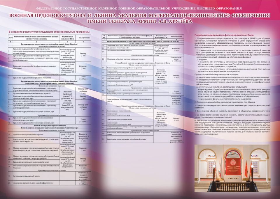 Она осуществляет подготовку высококвалифицированных кадров - специалистов материально-технического обеспечения для всех видов и родов войск Министерства обороны Российской Федерации, а также для других федеральных органов исполнительной власти, в которых законодательством Российской Федерации предусмотрена военная служба.