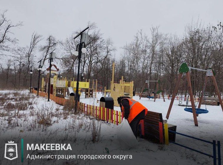 В Макеевке продолжается уборка детских площадок, построенных в рамках федерального проекта «Инфраструктура для жизни».
