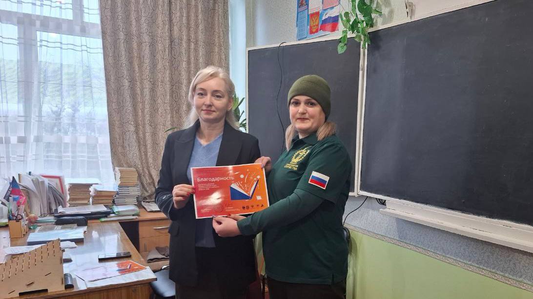 Руководитель КСВО ДНР в городе Макеевка Михайлова Дина Юрьевна посетилашкольников изсредней школы № 72 в Ханжонково.