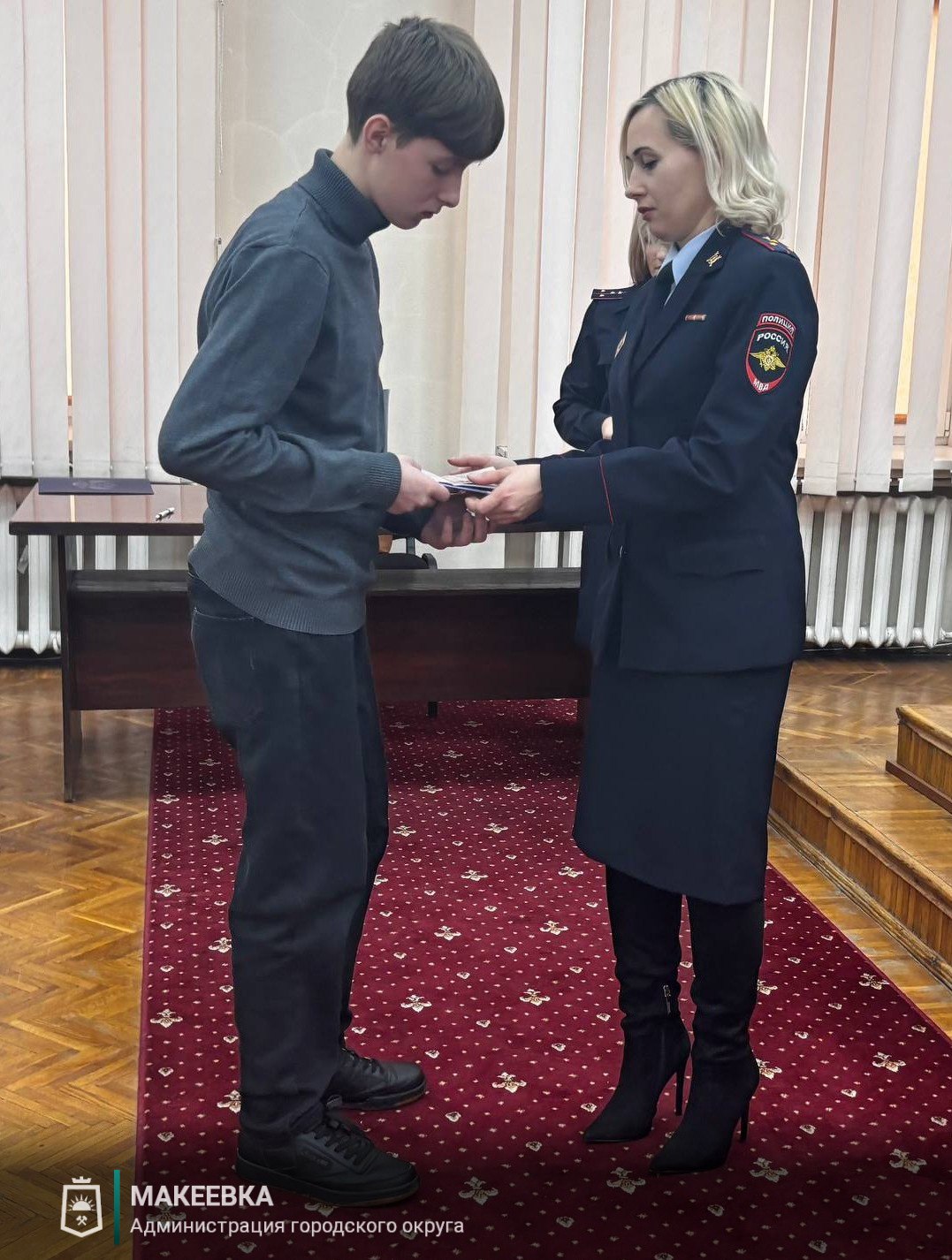 В мероприятии по вручению главного документа гражданина Российской Федерации юным жителям приняли участие первый замглавы администрации городского округа Макеевка Юлия Иванова и временно исполняющая обязанности начальника отдела по вопросам миграции УМВД России «Макеевское», капитан полиции Марина Павловна Калашникова.