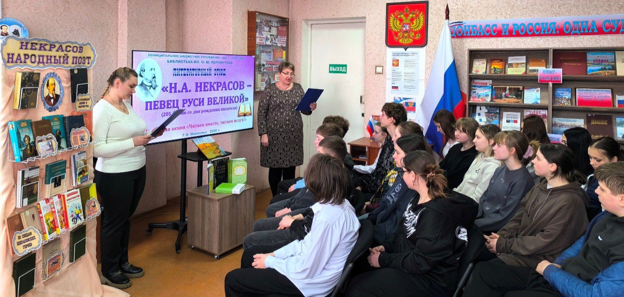 3 марта в библиотеке им. М. Ю. Лермонтова прошёл литературный этюд «Н. А. Некрасов — певец Руси великой», приуроченный к 205-летию поэта. Мероприятие стало настоящим путешествием в эпоху Некрасова для учащихся ГБОУ «ОШ № 25 г. о. Макеевки».
