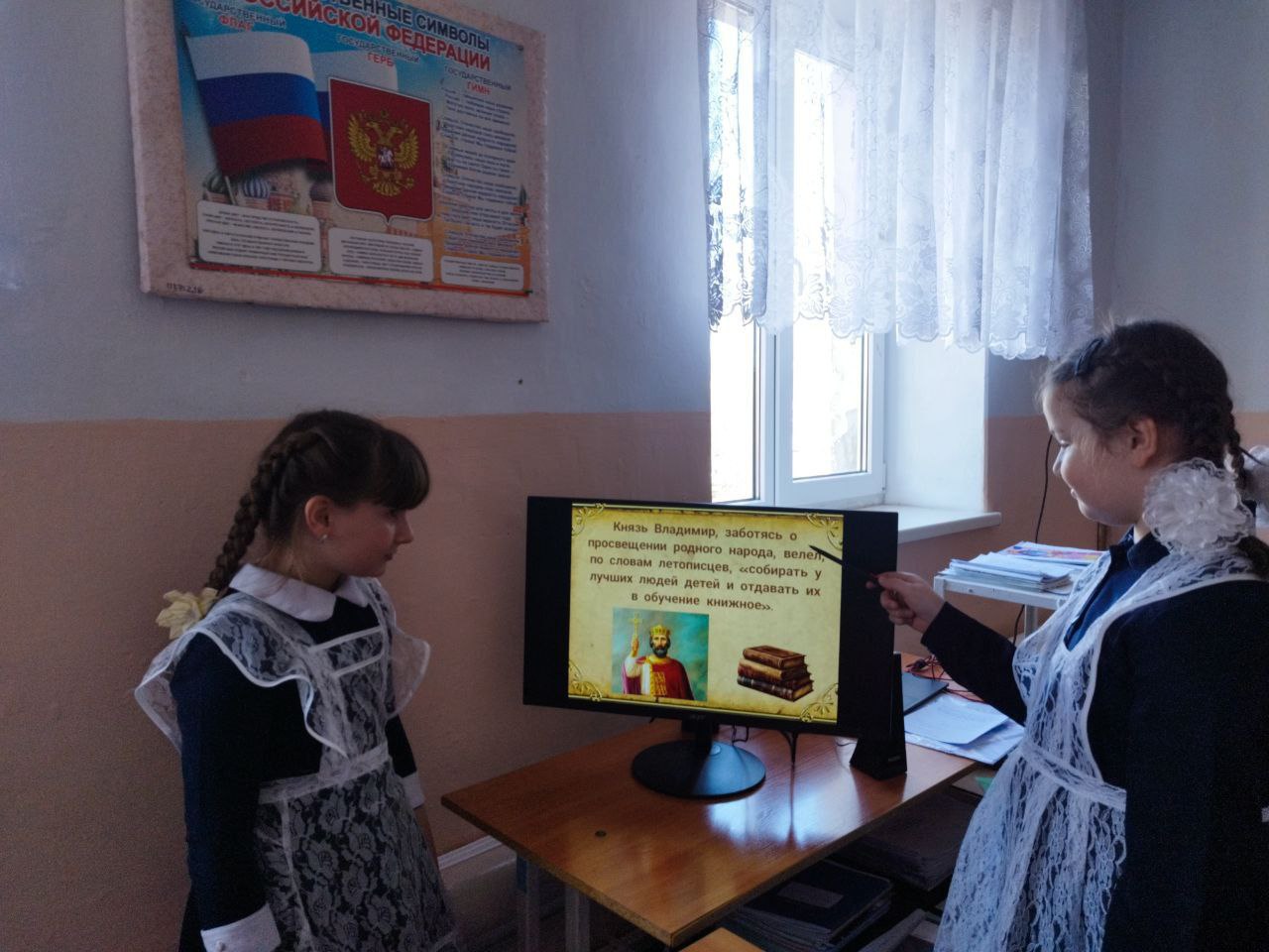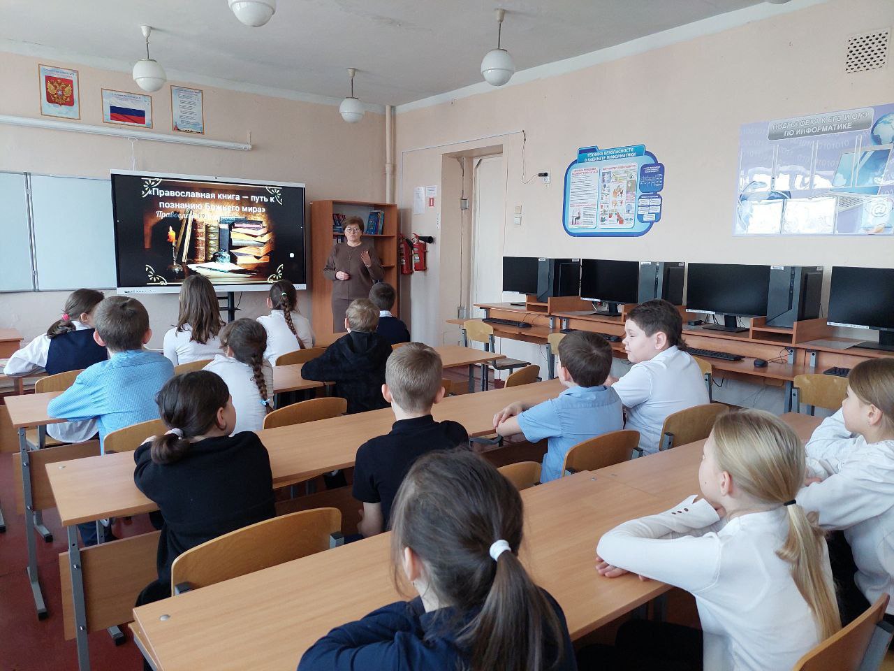 Преподаватели курса "Основы православной культуры" рассказали школьникам о традиции славянской книжности, о создании алфавита святыми братьями Кириллом и Мефодием, о рукописных книгах Руси, о первой печатной книге "Апостол" Ивана Федорова.