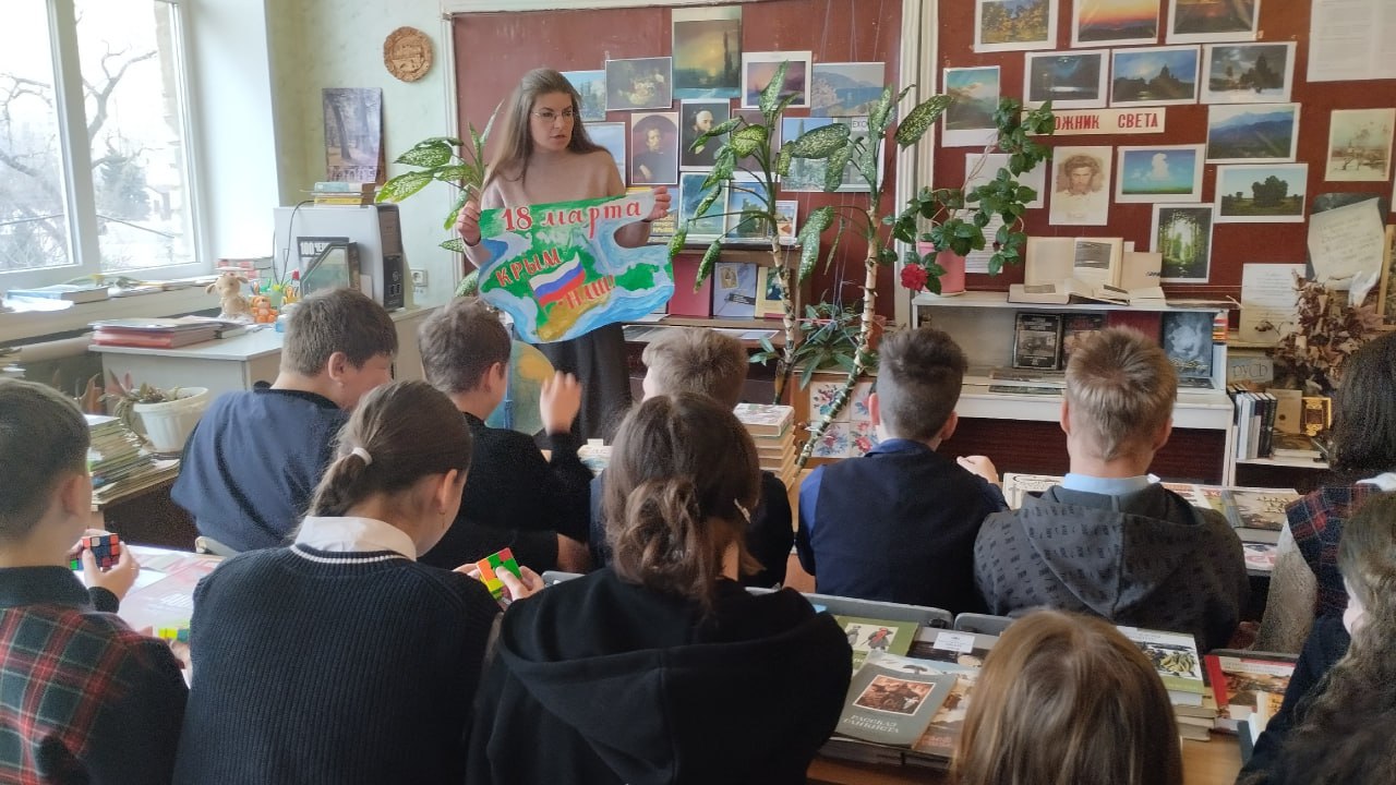 В общеобразовательных организациях городского округа Макеевка были проведены квесты, классные часы, литературные гостиные, посвящённые Дню воссоединения Крыма с Россией.