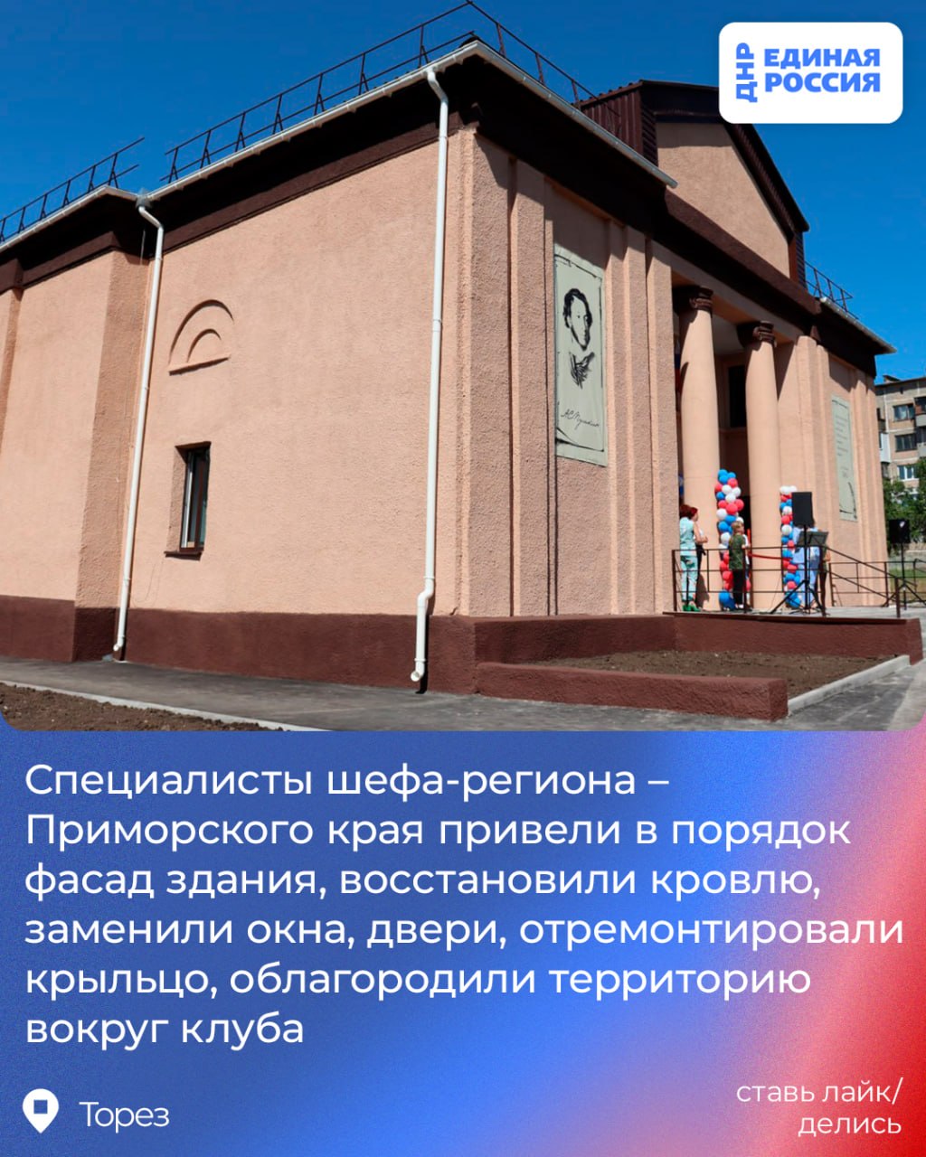 Восстановление клуба им. Пушкина в Торезе проходило по народной программе Единой России. Это здание было построено в 1954 году – 72 года назад. Более полувека никаких работ здесь не проводилось, и вот впервые за много лет прошёл капитальный ремонт. Специалисты шефа-региона – Приморского края привели в порядок фасад здания, восстановили кровлю, заменили окна, двери, отремонтировали крыльцо, облагородили территорию вокруг клуба.