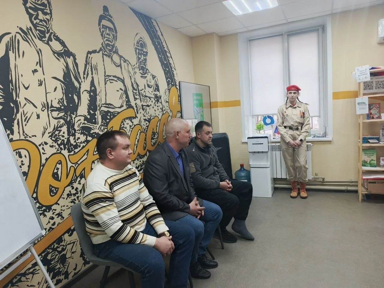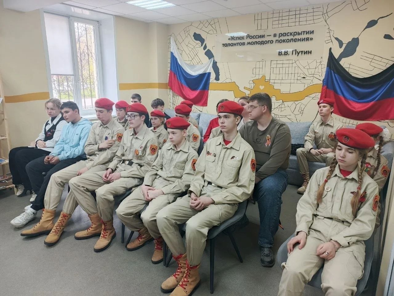 27 апреля в рамках проекта «Служу Отечеству» на базе молодежного пространства «Точка» ветераны боевых действий Андрей Морозюк и Виталий Сухин встретились с отрядом юнармейцев из Макеевки, чтобы пообщаться вживую с подрастающим поколением. В ходе диалога на равных герои рассказали детям о фронтовых дорогах, фактах из биографии и интересных историях.